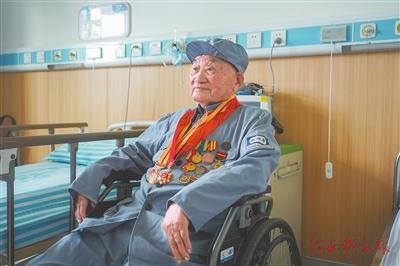 初秋時節(jié),中國人民解放軍聯勤保障部隊第908醫(yī)院的一間病房內,99歲的新四軍老戰(zhàn)士尤云儒再次穿上他掛滿勛章的軍裝,陽光透過窗戶灑在歷經歲月洗禮的勛章上,折射出點點金光。這位17歲便加入抗日游擊隊奮勇殺敵的戰(zhàn)士,如今臉上布滿溝壑,顴骨高挺,笑容慈祥,但眼神中依然透露著堅定與果敢。