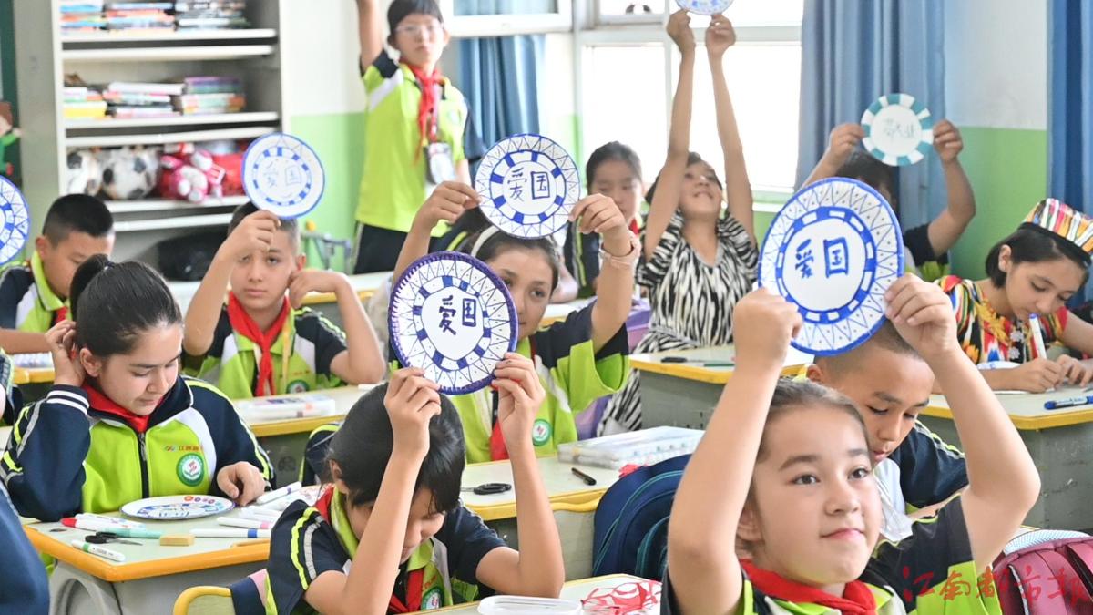 課堂后半程,成為孩子們綻放風(fēng)采的“同心舞臺(tái)”。身著艾德萊斯裙子的維吾爾族學(xué)生,拉起身邊漢族、柯爾克孜族小伙伴的手,踩著歡快的節(jié)奏跳起新疆舞。旋轉(zhuǎn)的裙擺像一朵朵盛開的花朵,在陽(yáng)光下劃出優(yōu)美的弧線,引得教室里掌聲與歡呼聲此起彼伏。在援疆教師的指導(dǎo)下,孩子們圍坐成圈,手里的剪刀輕輕開合,紅色的紙屑如花瓣般飄落,一個(gè)個(gè)邊緣整齊、寓意“民族同心”的剪紙作品漸次成型,被孩子們小心翼翼地捧在手心。大家還拿起五彩的畫筆,在圓形畫板上認(rèn)真勾勒“富強(qiáng)、民主、文明、和諧”等社會(huì)主義核心價(jià)值觀,用明亮的色彩、稚嫩的筆觸,一筆一畫傳遞對(duì)祖國(guó)最真誠(chéng)的祝福。