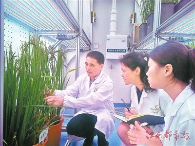 曾勇軍團(tuán)隊(duì)在實(shí)驗(yàn)室查看水稻長(zhǎng)勢(shì)。江西日?qǐng)?bào)全媒體記者李芳攝