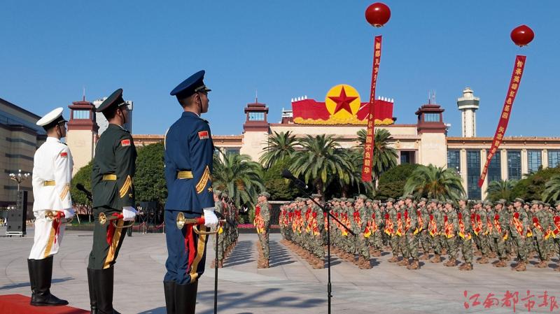 在南昌八一廣場(chǎng),一場(chǎng)以“紅土地吹響出征號(hào)、英雄城走出英雄兵”為主題的新兵歡送儀式在此舉行?;顒?dòng)現(xiàn)場(chǎng),500名預(yù)定新兵身著戎裝、胸戴大紅花整齊列隊(duì),來(lái)自江西省軍區(qū)某隊(duì)的司號(hào)員現(xiàn)場(chǎng)吹響出征號(hào),廣大新兵堅(jiān)定報(bào)國(guó)志,從容邁過(guò)從戎門奔赴軍營(yíng)。